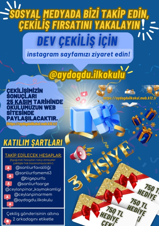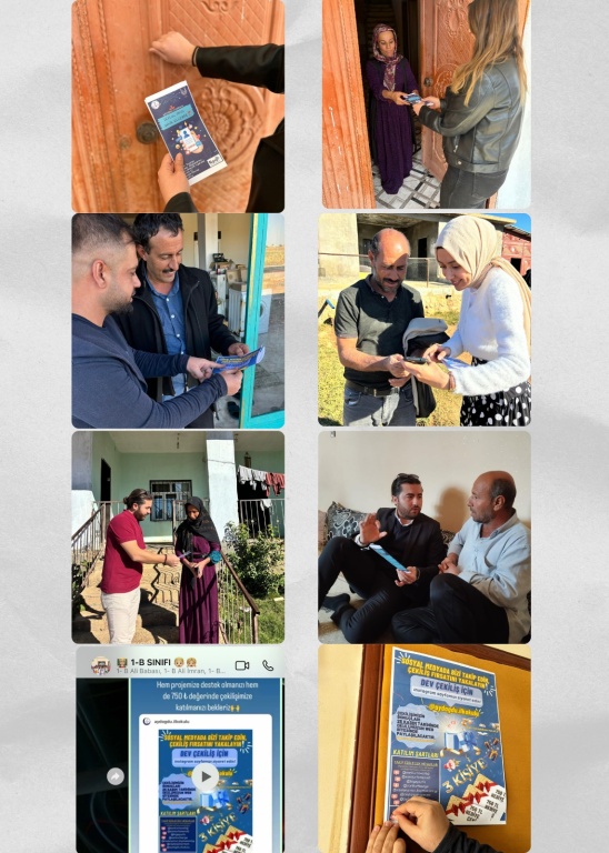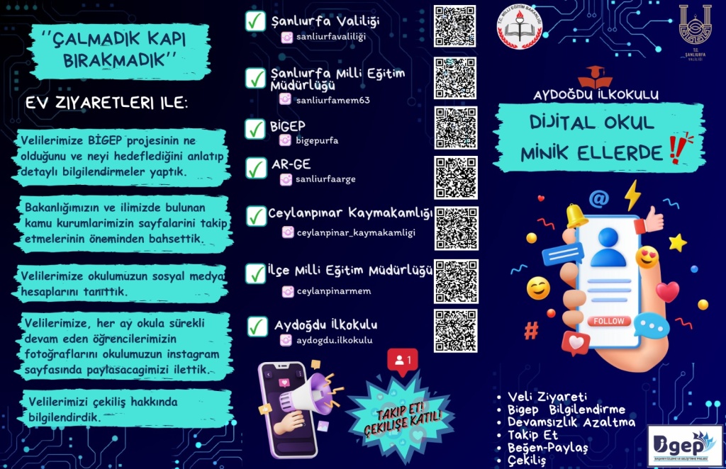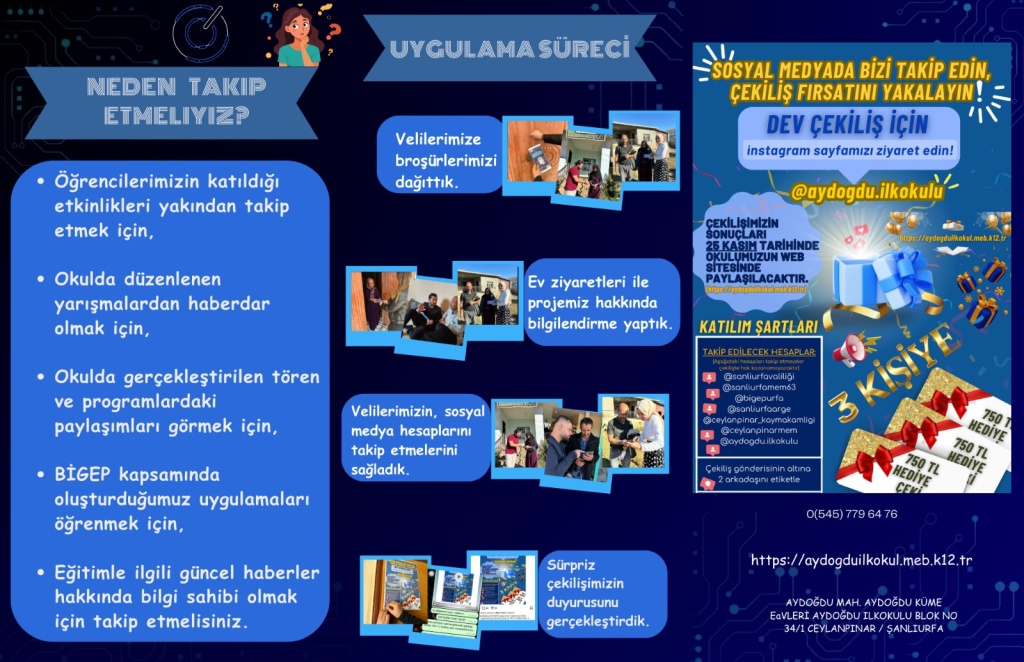 · Proje kapsamında öncelikle proje yürütücüsü olan öğretmenlere proje hakkında bilgi verildi. · “Çalmadık Kapı Bırakmadık” sloganı ile ev ziyaretlerini gerçekleştirdik. · Gerçekleştirdiğimiz ev ziyaretlerinde öğrencinin eğitim-öğretim durumları ve devamsızlık gibi başlıkların dışında yeni bir başlık açtık. Bu başlık altında okul sosyal medya hesaplarının takip edilmesinin önemini vurguladık. Velilerimize okul sosyal medya hesabımızı takip ederek okulda yapılan eğitim-öğretim faaliyetlerinden, etkinliklerden ve duyurulardan haberdar olacaklarını anlattık. · Velilerimize yine projemiz kapsamında gerçekleştirdiğimiz ve proje broşüründe belirtilen 27 Ekim 2024 günü okul sosyal medya hesabımızdan başlattığımız 750 TL ödüllü çekilişe katılım şartlarını anlattık ve Şanlıurfa Valiliği, Şanlıurfa İl Milli Eğitim Müdürlüğü, BİGEP Urfa, Şanlıurfa ARGE, Ceylanpınar Kaymakamlığı, Ceylanpınar İlçe Milli Eğitim Müdürlüğü ve Aydoğdu İlkokulu instagram sayfalarını takip etmelerini sağladık. Velilerimize bu sayfaları takip ederek ilimizde ve ilçemizde gerçekleşen her türlü doğru bilgi ve duyurulara, eğitim-öğretimde gerçekleşen güncel gelişmelere en doğru kaynaklardan ulaşacaklarını anlattık. · Velilerimize, uygulamamızın aşamalarını gösteren broşürümüzü ve çekiliş afişimizi ev ziyaretleri, veli whatsapp grupları ve köy muhtarlığı vasıtasıyla ulaştırdık. · Velilerimize devamsızlık sorununu en aza indirmek için sosyal medyanın ödüllendirici gücünü kullanarak o ay içinde en az devamsızlık yapan öğrencilerin fotoğraflarının okul sosyal medya hesabımızdan paylaşılacağından bahsettik. · Proje kapsamında başlattığımız çekilişin süresini 1 ay olarak belirledik. · 2 gün aralıklarla takip edilmesi gereken sayfaların takipçi sayılarını kayıt altına aldık. Bu veriler sonucunda bir sütun grafiği oluşturduk. · Çekiliş sonuçlarının okulumuzun internet sayfasından 25 Kasım 2024 tarihinde duyurusunun yapılacağını belirttik. |